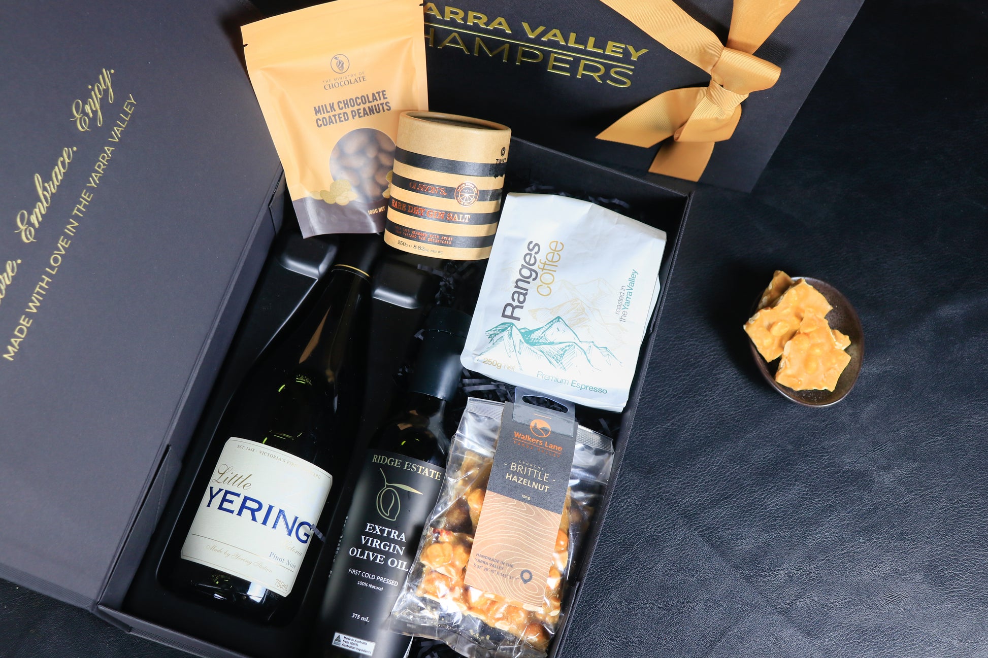Celebrate that new home feeling with this thoughtful collection of Yarra Valley essentials, featuring some special gourmet treats for that new pantry. Yering Station’s Little Yering Pinot Noir is elegant and smooth, ideal for toasting special moments. A Premium Extra Virgin Olive Oil from Ridge Estate and Olsson's Dry Gin infused salt to bring a touch of gourmet flavour to the kitchen. Ranges Coffee Premium Espresso adds warmth and energy to mornings in a new home and for a sweet indulgence, Walker’s Lane Macadamia Brittle provides the perfect crunchy treat. Beautifully presented in a black gift box with ribbon and gift card, this hamper is a sophisticated way to say Congratulations, welcome to your new home!