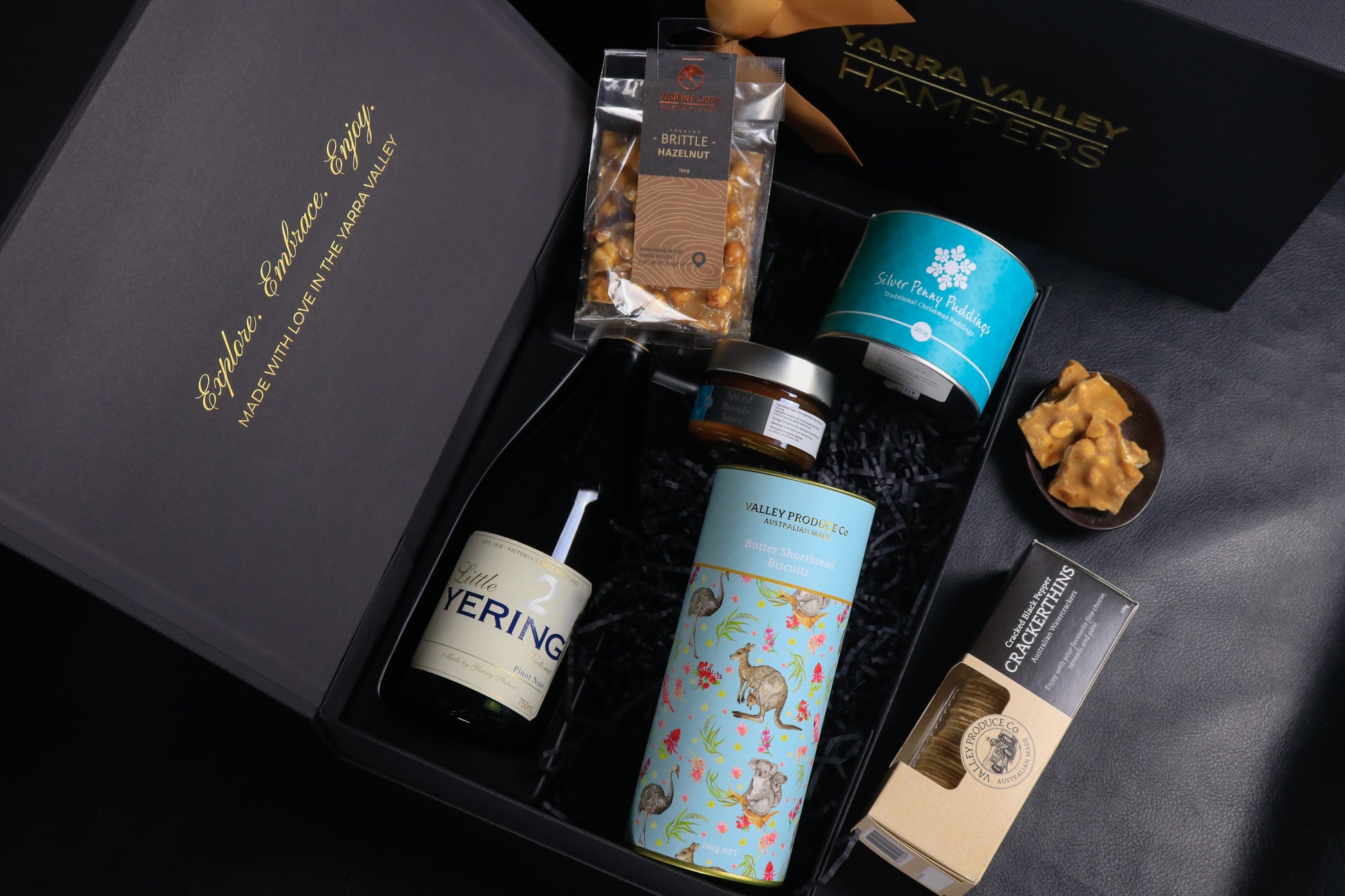 This hamper includes Yering Station's "Little Yering" Pinot Noir, a Victorian favourite and great representation of Victorian Pinot Noir and the broader Yering Station range of wines. Silver Penny Puddings provides a Christmas classic with their Traditional Christmas Pudding, with more than enough Brandy Sauce to go with. Valley Produce Co's Butter Shortbread in a keep-sake tube is a great addition to any Christmas selection.